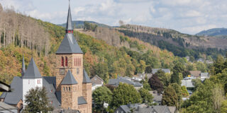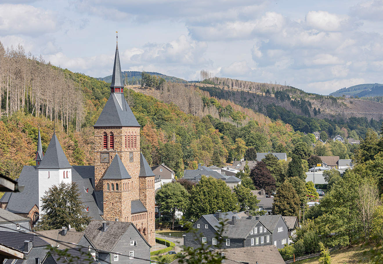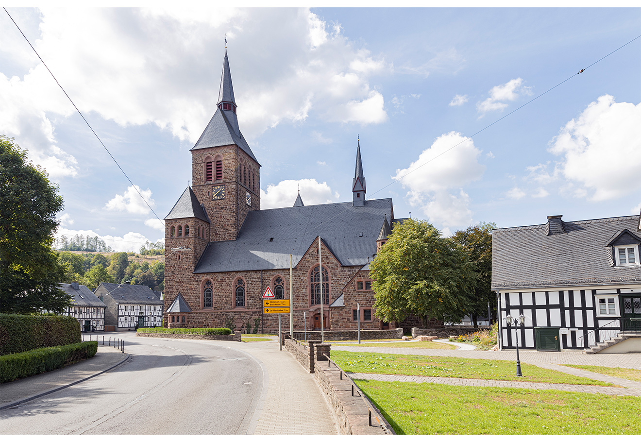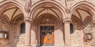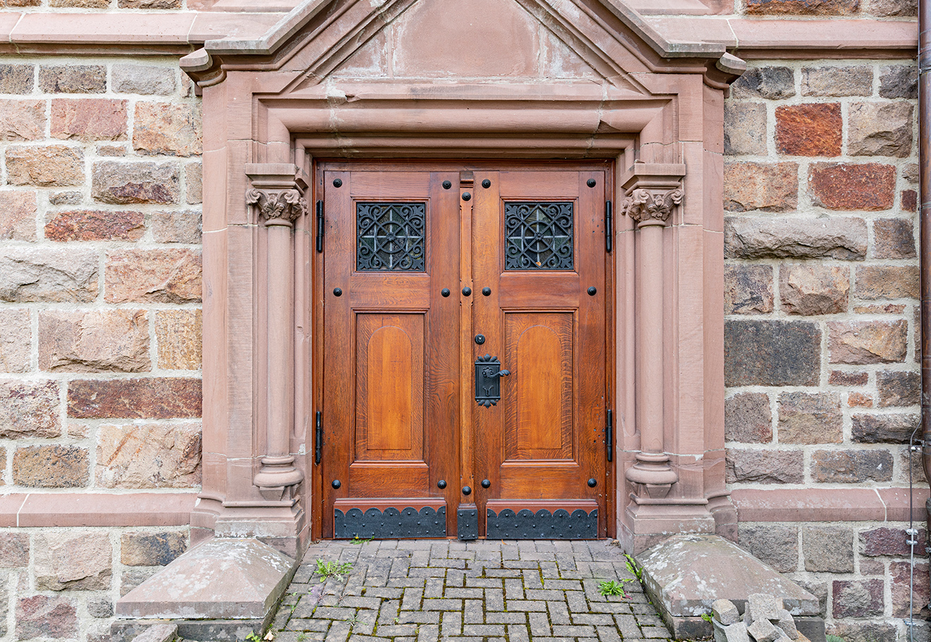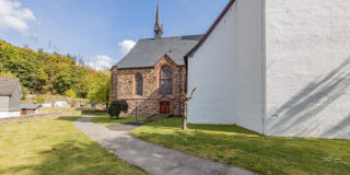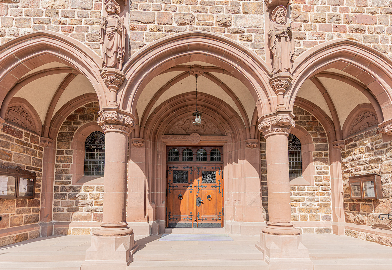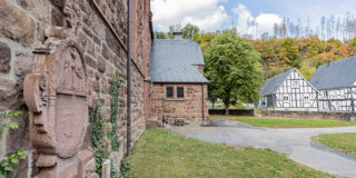 Sanierungsarbeiten an der Natursteinfassade und neue Dacheindeckung aus Schiefer.
